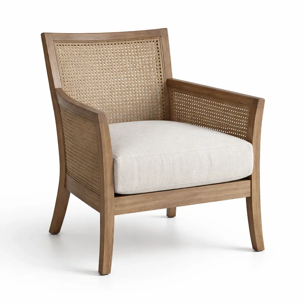 Der Sessel besteht aus einem Holzrahmen und einer Rattan-Rückenlehne. Der Sitz ist mit Leinenstoff gepolstert.